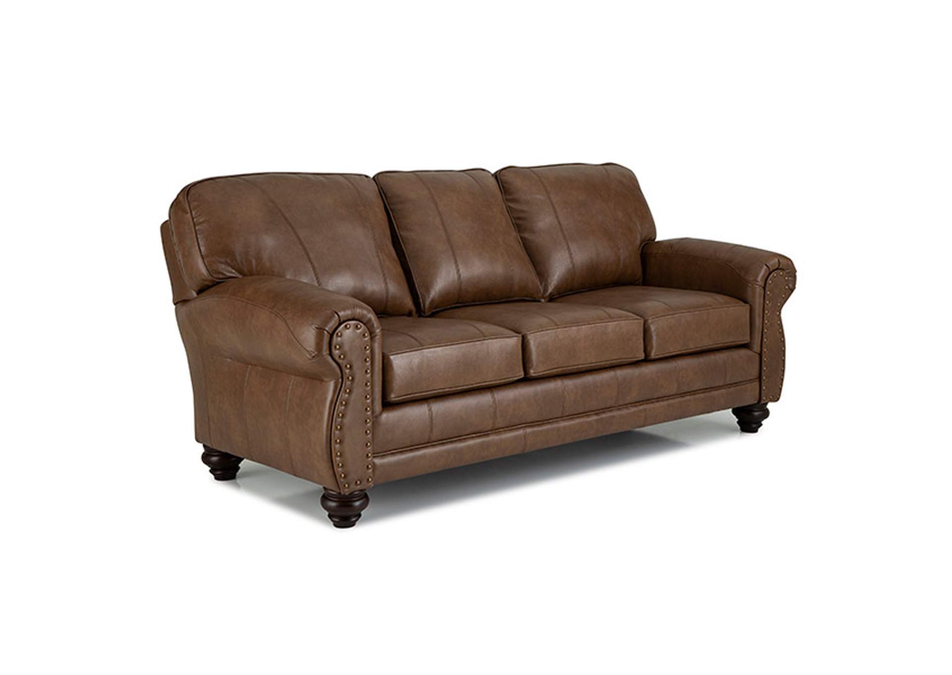 Feel right at home when you relax in this top-grain leather stationary sofa, loveseat, club chair and matching ottoman. The blown, semi-attached square back is banded and corded with the added comfort of a baffled bag in the back. The smooth, rolled arms flow into the stepped-in back where they converge with the contoured and padded lower arms. The front of the arms are accented with brass tacks for a distinguished look. Comfort is not sacrificed by style as the cushion features encased coil springs giving a resilient, yet plush feel. Make it yours by choosing from select top grain leathers.