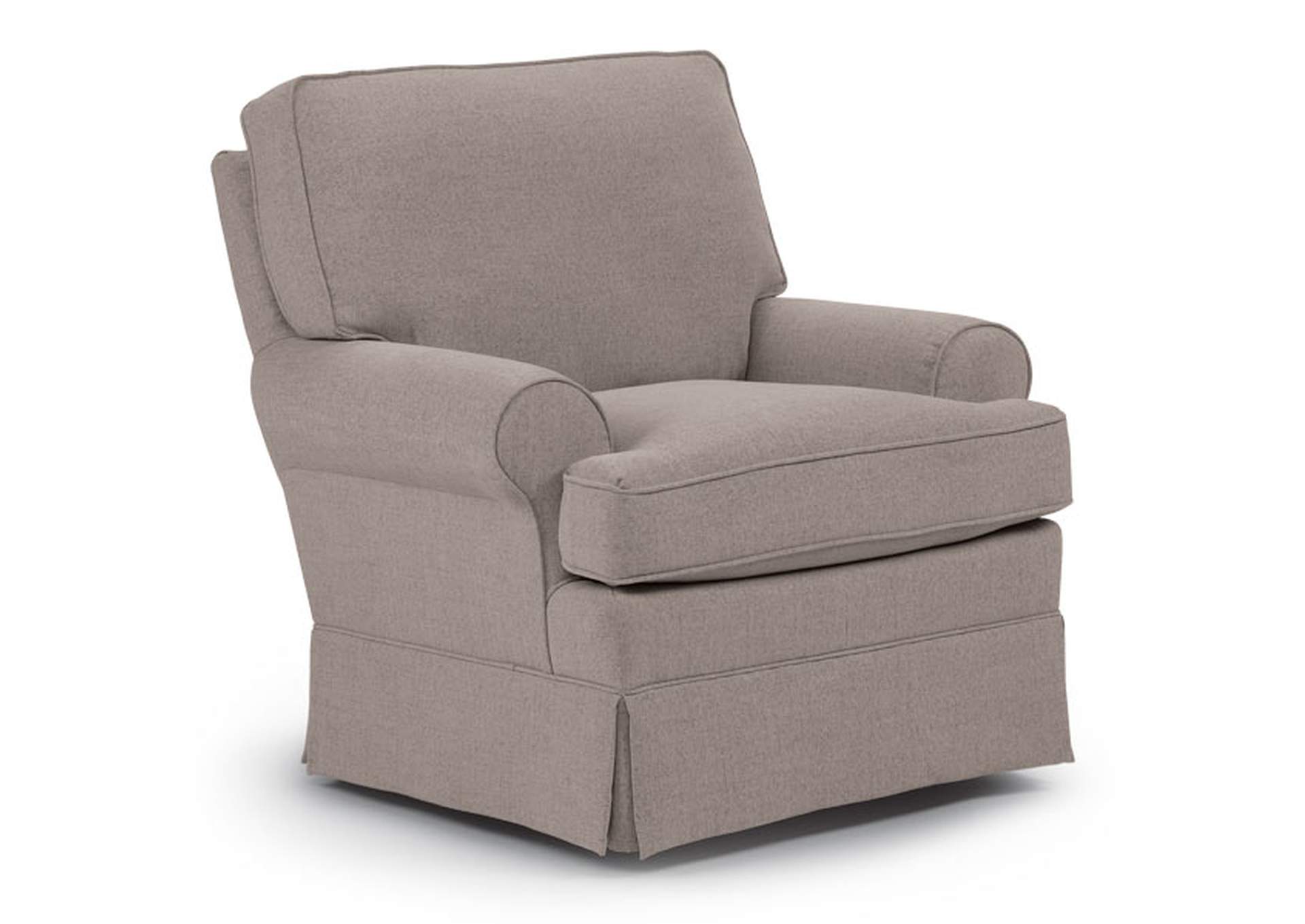 Traditionally styled this Swivel Glider chair features a heavily cushioned pillow back and reversible, banded seat cushion. The large, rolled arms are accented with cording, dressing up this beautiful chair. The look is finished off with a slightly taller skirt. It is also available as a stationary Club Chair. Put your feet up with the matching glide ottoman.