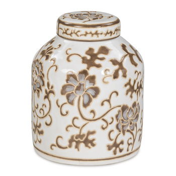 Evoke the feeling of a treasured heirloom with this exquisite jar. The warm palette and delicate floral pattern add a layer of curated worldly style to your favorite spot. Let it stand alone as a sophisticated art piece on your mantel, or fill it with a few fresh stems to bring a touch of life to your room.