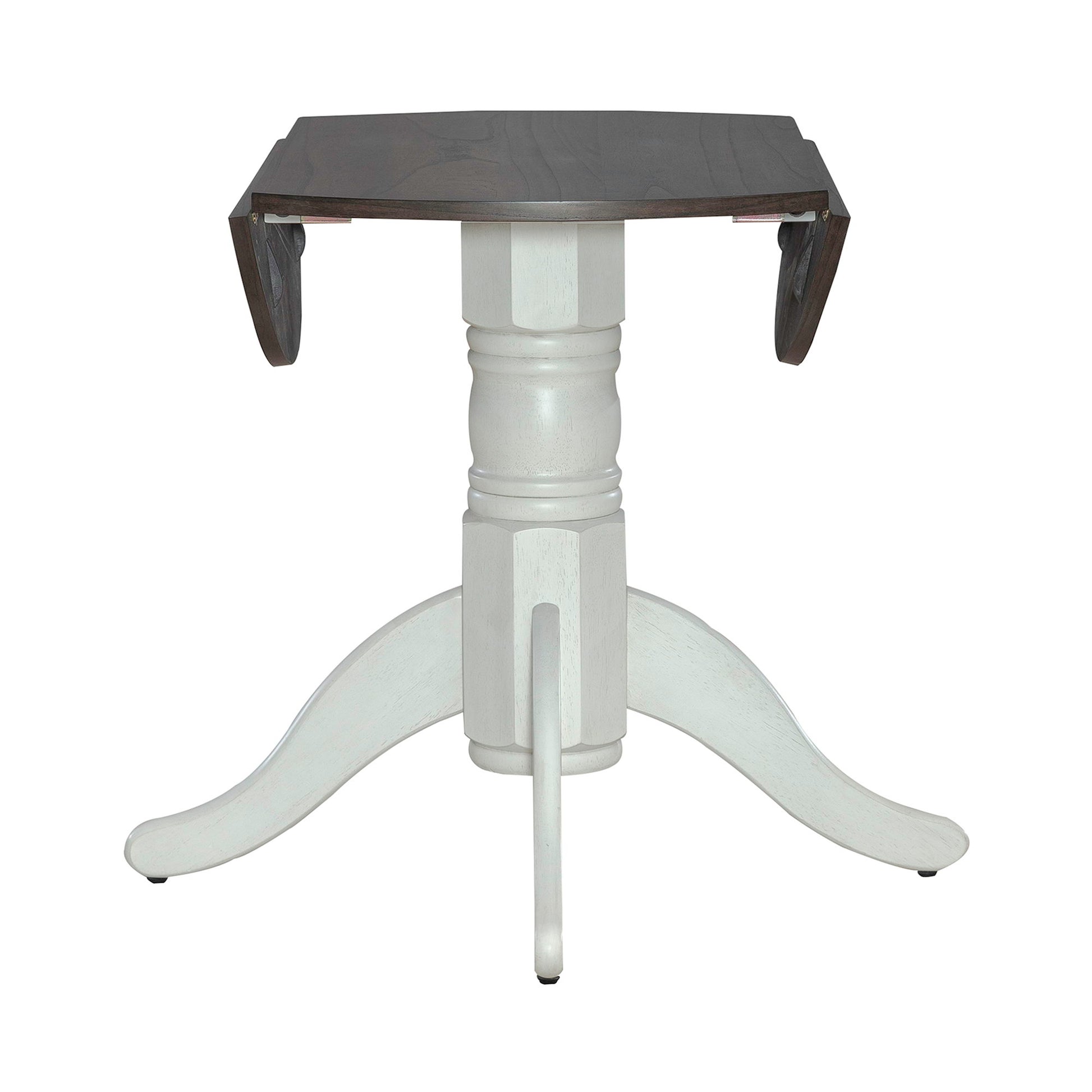 Feel at home with the Brook Bay drop leaf table set. Crafted with excellence using rubberwood solids and mindy veneers, this table features a two-tone Carbon Gray and Textured White finish. There are two 8” drop down leaves on the top, allowing the user to save space when needed. The pedestal base is heavy turned and is supported by shaped splayed feet. Feel comfortable and elegant at the same time with the Brook Bay drop leaf table set.