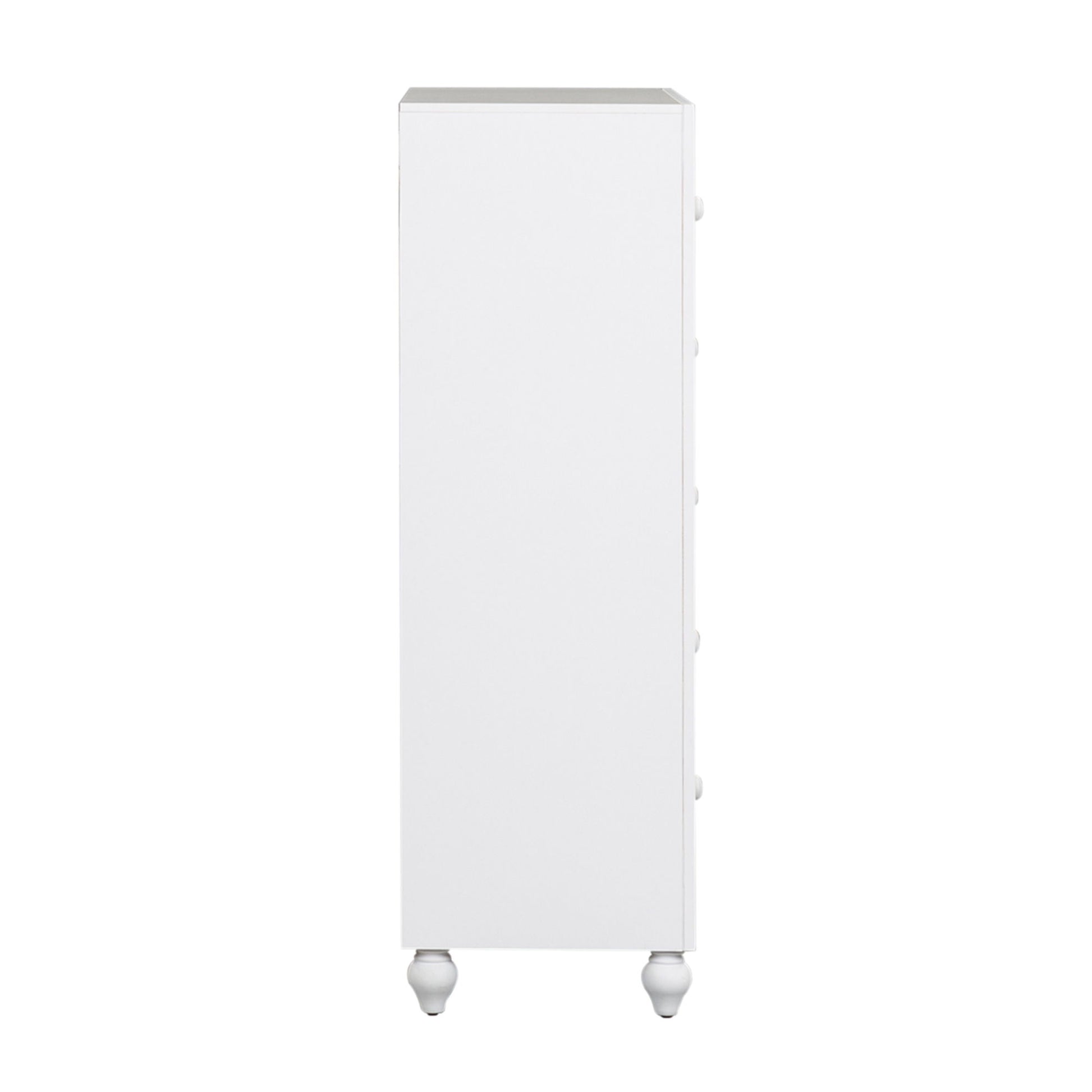 Indulge in cottage design with the Cottage View 5 drawer chest. Crafted by melamine and a rubberwood solid frame, this piece features kenlin drawer glides, bottom case dust proofing, solid wood picture framed molding, laminate drawer interior, bluff cut top drawers, wood knob hardware, and is anchored by bun feet. This piece is available in an alternate finish and the melamine is scratch resistant, sure to make this piece last in any home.