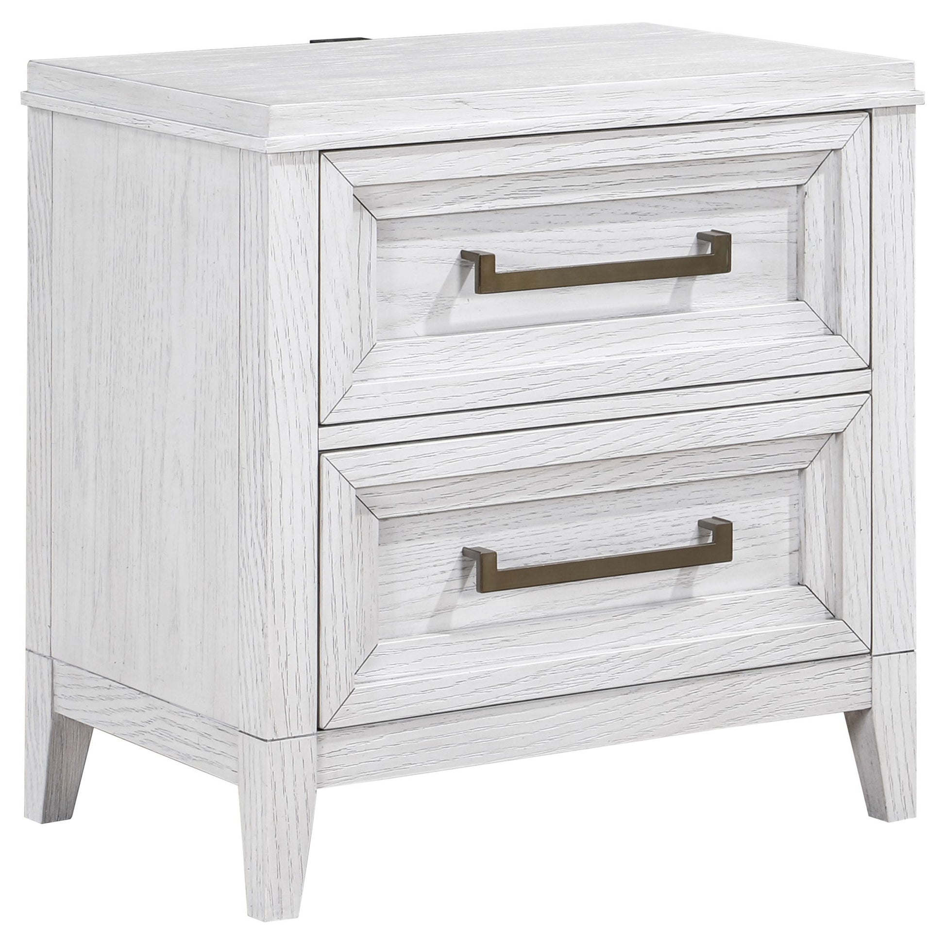 Bring fresh perspective to your bedside with a modern two-drawer nightstand. Its casual style and classic stance create a restrained look and feel, perfect for a soothing bedroom space. It features a distressed white finish over wood grain, creating subtle depth and detail. Drawers are roomy for bedside essentials, and stepped fronts add character and dimensionality. Contrasting antique brass toned bar pull complete the look, offering stylish allure in your stylish bedroom.