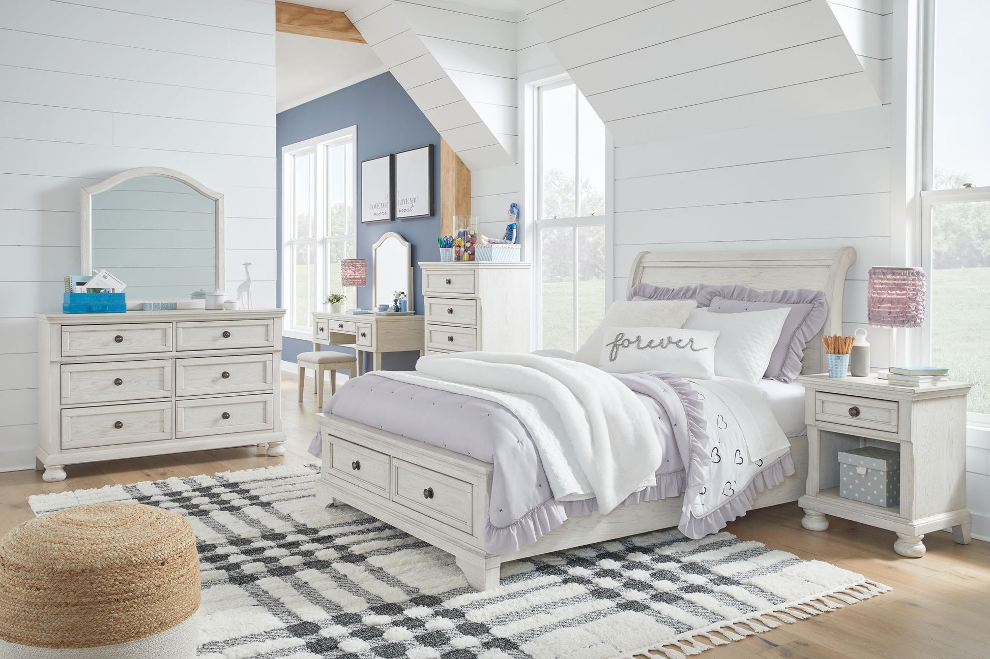 Elegant, timeless furnishings take your bedroom to the next level. Nothing does that better than this mirrored vanity with bench. The antiqued white finish with a wonderful grain texture radiates sophistication, while dark bronze-tone knobs add an ornate touch. Three storage drawers and a soft cushioned seat round out this tasteful set.