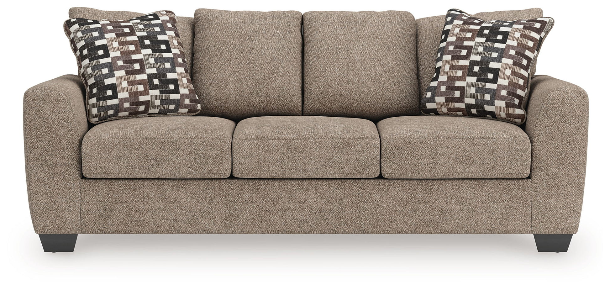 Transitional and right on trend. This sofa’s upholstery is a delightful change from the ordinary, with hints of soft brown giving the gray hue added depth. It’s punctuated with chic accent pillows in an eye-catching, stylized stripe design. Whether you're hosting friends and family or relaxing solo, this sofa invites homey, comfortable character into your space.